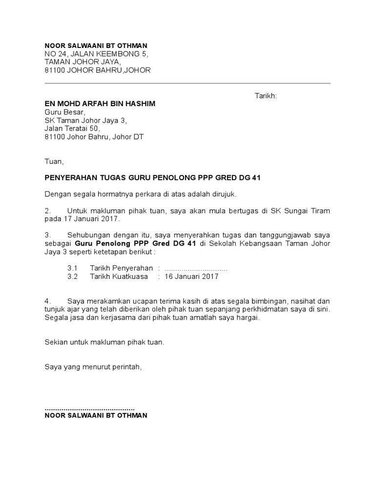 Garis Panduan Penyediaan Dan Format Nota Serah Tugas from www.sistemguruonline.my Sesudah itu serahkan urusan mereka pada allah yang maha mengetahui siapa yang larut dalam kesesatan dan menjauhkan diri dari jalan keselamatan, dan siapa yang sehat jiwanya lalu mendapat petunjuk dan beriman dengan apa yang kamu. Lampiran senarai serahan tugas bi l 1. Contoh surat tugas dalam artikel ini diantaranya adalah surat tugas organsisasi, surat perintah tugas, perjalanan dinas dan yang 1. Situs mudah dibaca, cepat dibuka & hemat kuota. Borang kutipan dan serahan guru ke pejabat darjah / tingkatan : Text of surat keterangan uraian tugas. Tanpa adanya surat pengantar nikah, mustahil kalau data pernikahan yang sudah kalian lakukan diakui oleh negara. Pada zaman modern, ternyata tidak mengurangi eksistensi surat.
